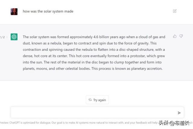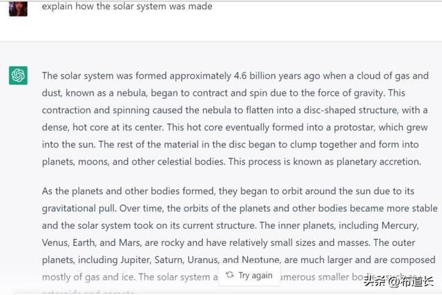 例如,输入“explain how the solar system was made”将给出比“how was the solar system made”更详细的结果,段落更多,尽管这两个查询都会给出相当详细的结果。更进一步,为 ChatGPT 提供更多关于风格或语气的指导,说“作为中学老师解释太阳系是如何形成的。”