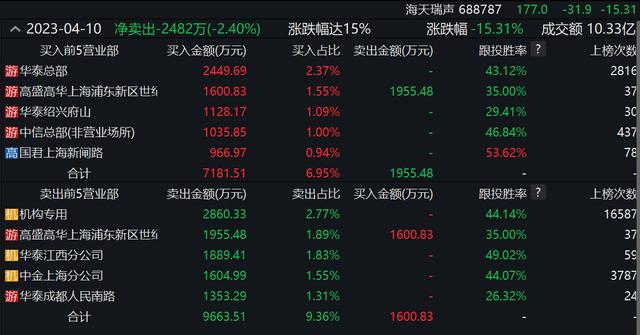 海天瑞声龙虎榜的卖出前五出现了3个机构席位,分别是机构专用席位、华泰证券江西分公司和中金公司上海分公司,三机构合计净卖出6354.73万元。