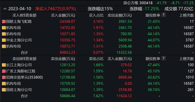 科大讯飞盘后龙虎榜显示,共有5个机构专用席位现身昆仑万维龙虎榜,分别位列买二、买四、买五、卖一、卖五位置,合计净买入1876.67万元,同样是多方力量略占上风。值得注意的是,知名游资国泰君安上海江苏路营业部大举买入该股41095.51万元,并卖出77.1万元。