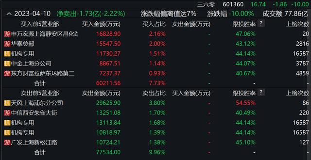 盘后龙虎榜显示,共有5个机构专用席位现身三六零龙虎榜,分别位列买三、买四、卖一、卖三、卖四位置,合计净卖出32960.93万元。