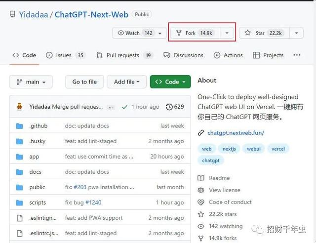 首先,需要将ChatGPT-Next-Web代码fork到自己的GitHub存储库中。这个步骤比较简单,只需要在GitHub页面上点击fork按钮即可。 (ChatGPT Next Web网址: https://github.com/Yidadaa/ChatGPT-Next-Web)