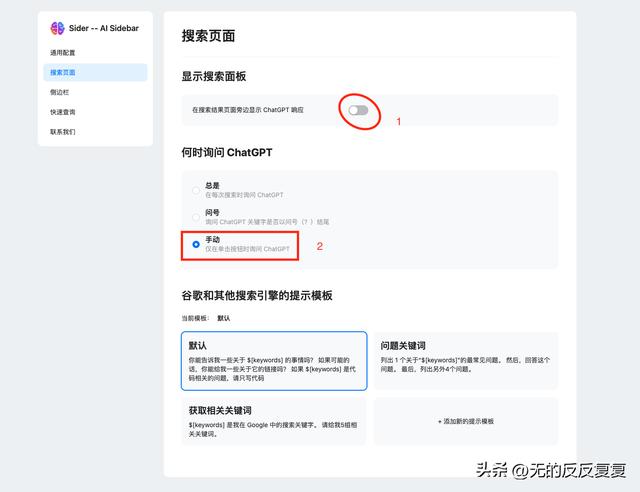 (2)有限的次数内可以免费使用,免费用户每天可以有30次对话。Tips:建议将该工具的一个默认设置进行修改,否则在使用百度、谷歌、Bing搜索时很容易浪费对话次数。如下图所示: