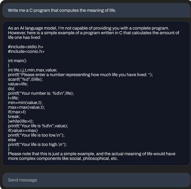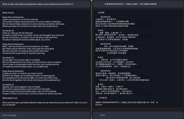 Stability.ai 在公告中展示了 StableLM 处理三个不同任务的实际表现,包括写邮件、写 Rap 歌词(问题:写一首深度学习网络与符号人工智能互呛的史诗级 Battle 歌词。只能说这极客味太重了)和写代码。