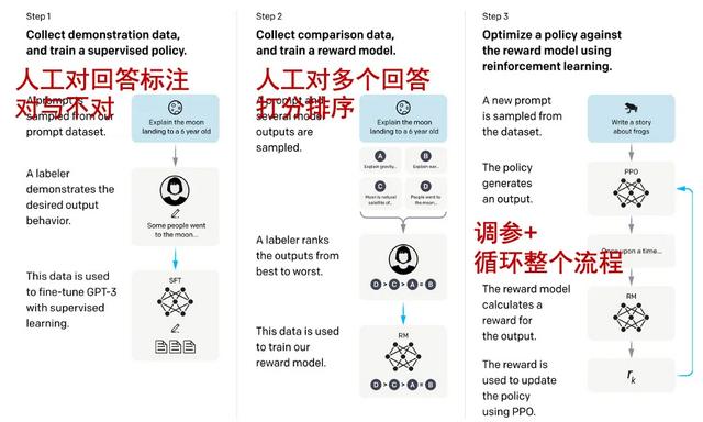 这个图是InstructGPT论文中给出的炼丹过程,也就是RLHF(基于人类反馈的强化学习),大概得意思是,基于GPT3,第一步提一些问题,并人工对回答进行标注,标注对与不对,然后训练出SFT模型。第二步基于SFT,提问,然后回复多个答案,人工对多个答案进行打分,得出4个答案的得分排序,得出RM模型,就是奖励模型。第三步就是利用PPO算法继续调整模型的参数,让他生成的答案可以达到RM模型中更好的答案。最后循环这个流程,得出的就是instructGPT。