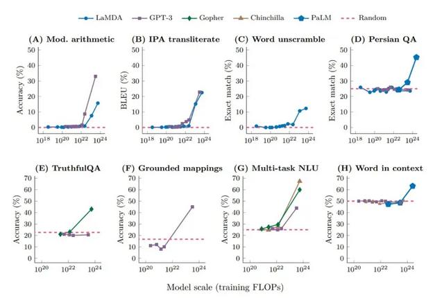 从这个图中是5个语言模型的8种涌现能力,可以看出,在某一点前,效果会比较一般,或者没有。但模型到达一个阈值时,效果就得到了大大的提升。