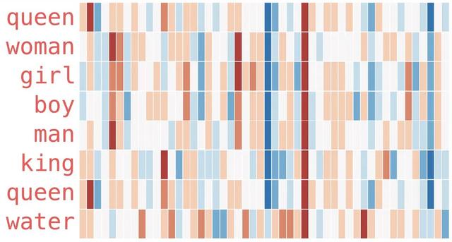 上图展示了,每个单词对应的语义化向量,每个向量中,会有不同的维度,每个维度表示了不同的语义。当两个单词在某维度上的语义相近的和话,那么他们的数值就会相近(图中为颜色相近),反之则差距较大。在这个时间点开始,也出现了万物皆可向量化的风潮。