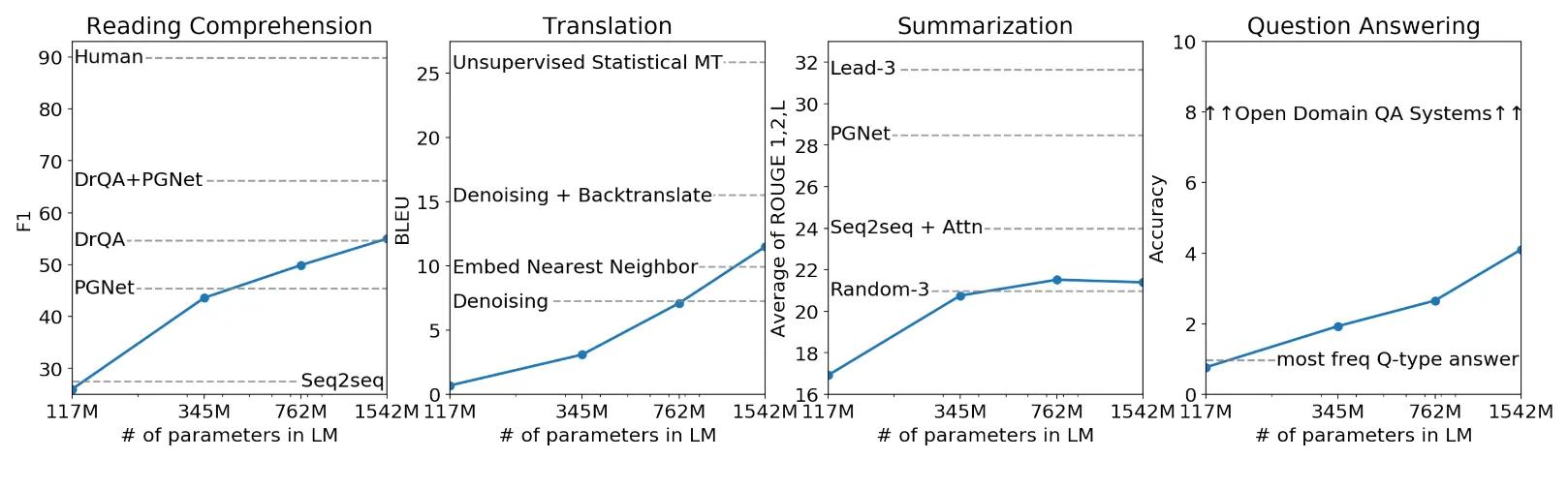 图中是GPT2在4个未经微调的任务执行的效果,折线为GPT2,虚线为对比的模型。可以看出,在模型足够大的时候,在某些任务下的效果已经超过了,有监督学习的模型。当然还是有些任务效果是比较差的,但总体是上涨的趋势,所以只要模型再大点,效果就会超过大部分的模型。