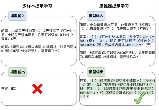 在ChatGPT中,有个思维链能力,如图所示,直接提问,ChatGPT无法给出正确的答案,但在提问前,先教GPT怎么做题,然后再问问题。此时ChatGPT会体现出举一反三的能力。