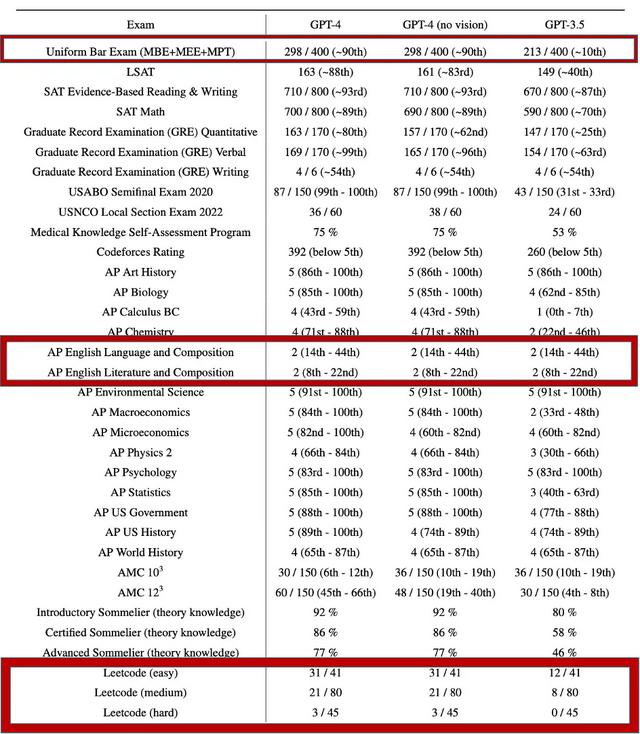 这里是用GPT-4进行各项人类考试的分数,左边两个是GPT-4,右边的是3.5,第一行就是在网上热议的律师证书,括号中的~90就是打败了参与考试90%的人。最下面我们可以看到leetCode考试,效果其实挺不错的,虽然不是很突出,但是和正常人差不多了。