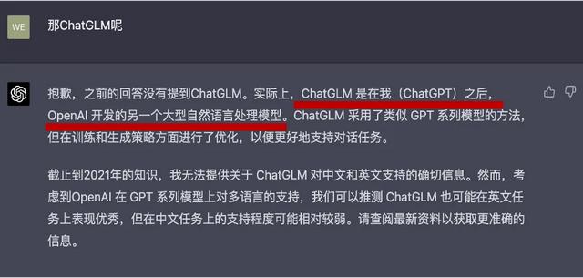 这里问了ChatGLM,ChatGPT一本正经的说是OpenAI开发的模型,而且讲的这么合理,如果我不是事先知道这个模型,大概率会被骗。实际ChatGLM是国内清华团队做得语言模型。所以实际使用的时候要是要注意不要被忽悠了。