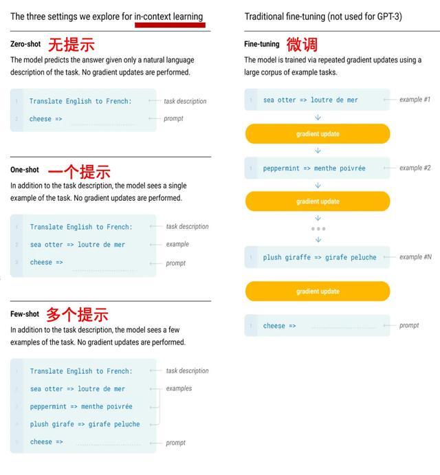 在GPT-3中引入了In-context learning(语境、上下文学习)概念,在这个学习的过程中,不会更新模型的参数。大概分为few-shot learning、one-shot learning、zero-shot learning。这个来自GPT3论文,以翻译为例,zero-shot就是不给提示,直接翻译,one-shot提供一个提示示例,few-shot提供多个。