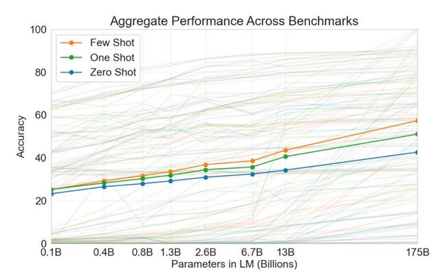 这是最终得到的准确性效果,可以看出在模型参数增大的情况下,准确性都会提高,并且给较多的提示,准确性会提升的的更多。这里的相当于在和GPT-3聊天的过程中,GPT-3能够理解上下文,根据上下文更好的完成当前的任务。