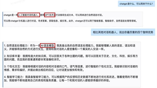这里还是去问了一下TChatGPT,上面是GPT3.5的回复,可以发现红线的回答是有问题的,都是乱讲的。