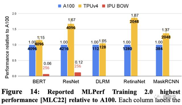 对于相似规模的系统,TPU v4在BERT上比A100快1.15倍,比IPU快大约4.3倍。对于ResNet,TPU v4分别快1.67倍和大约4.5倍。