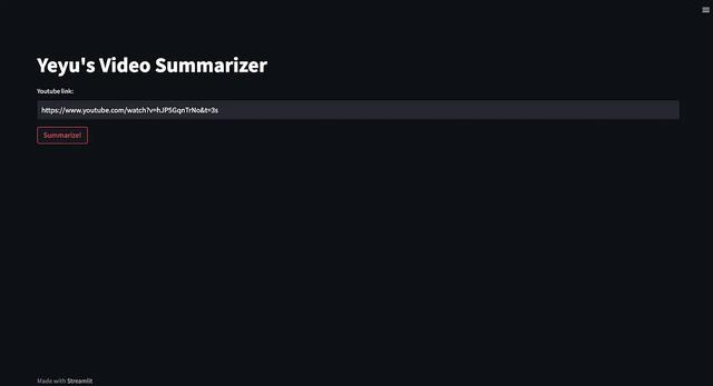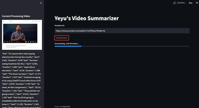 通过将数小时的视频内容转换为几行准确的摘要文本,视频摘要器可以快速为我们提供视频的要点,这样我们就不必花费大量时间来完整观看它。 在我创建这个网络应用程序之后,我最常使用的场景是参考它的摘要来决定某个视频是否值得观看,尤其是那些辅导、脱口秀或演示视频。
