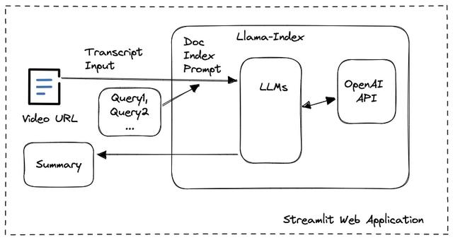 在这个Video Summarizer应用程序中,我们以llama-index为基础,开发了一个Streamlit web应用程序,为用户提供视频URL的输入以及屏幕截图、文字记录和摘要内容的显示。 使用 llamaIndex 工具包,我们不必担心 OpenAI 中的 API 调用,因为对嵌入使用的复杂性或提示大小限制的担忧很容易被其内部数据结构和 LLM 任务管理所覆盖。