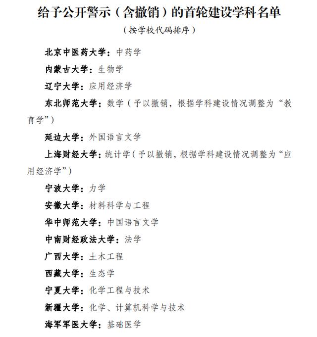 首轮一流学科中,有15所高校的16个学科被公开警示。公开警示学科,2023年接受再评价,再评价未通过的,将调出建设范围。