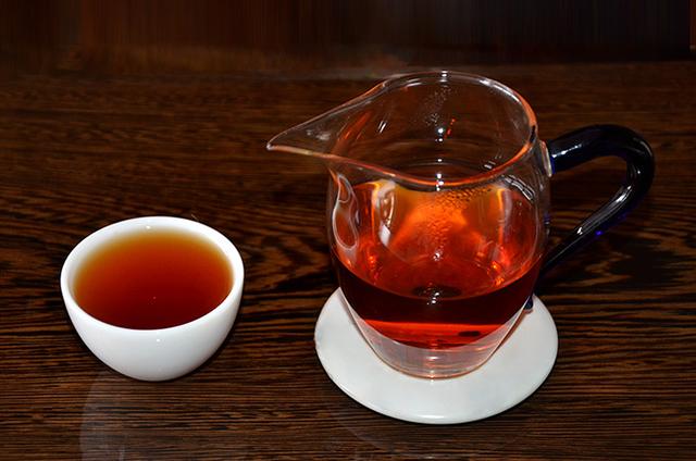 汤色相对比较透亮,颜色为宝石红。茶汤入口水性细柔滑顺,润喉略带甘蔗微甜,茶气颇强,茶韵浓郁!
