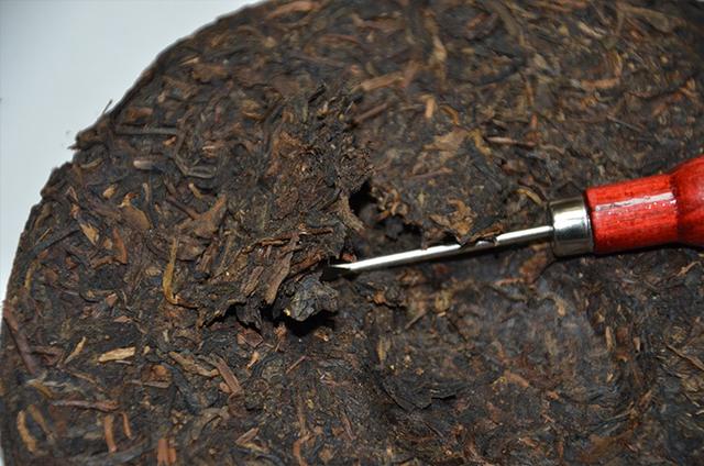 饼身厚实,呈栗红色,看条索,已经转化非常足,条索基本转为一个老茶的红褐色,年代感十足。
