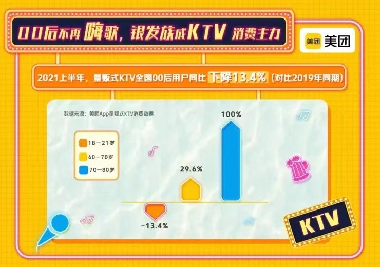 根据相关数据显示,2021年上半年,全国量贩式KTV中,18-21岁年龄段的用户数同比下降13.4%。但是同时期,全国60-70年龄段的量贩式KTV用户数同比增速为29.6%,70-80年龄段老人在量贩式KTV用户数的同比增速更是高达100%。