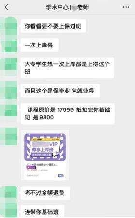 据工作人员介绍,本课程属于全过程托管班,班主任全程服务他成功上岸。听对方介绍,专科生通过率挺高的,他报了一个5999元的基础班。