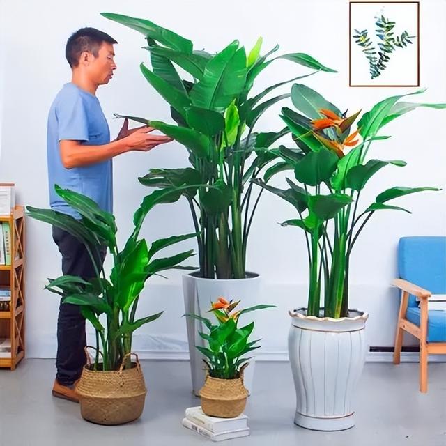 叶大,植株挺拔,大气高档,但观叶型不易开花。如果客厅比较小,可以选择小鹤望兰。它的叶子是灰绿色的,但它更喜欢开花,晒太阳,开出展翅飞翔的鹤花。那真是美洛花,但在花店买的时候,一些四五十厘米小的鹤望兰插上一朵小红花,冒充鹤望兰开花。购买时一定要仔细看清楚,不要上当受骗。