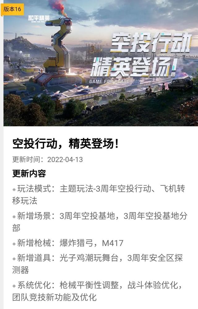 原空军基地区域改为空投基地,空投基地包含丰富的材料和复活卡让玩家在第一次死亡后复活,除了基本空投,还将刷新基地角三周年超级空投,现在空投基地已经成为每个人都想去的地方,无论基地开车多远,基地上方基本上会有50多人跳伞。