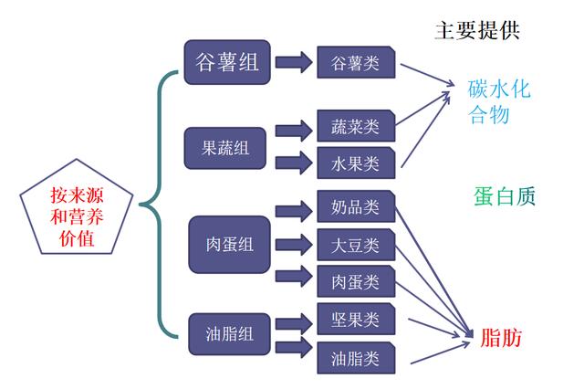 把所有食物按照营养价值特点分为不同种类,规定每份食物的热量是90kcal。同类食物可以按份数相互交换,比如以粮换粮,以豆换豆,以奶换奶。一般可以分为4组8类食物,因为同一类食物的营养价值差别比较小,在份数相同情况下相互交换,营养价值不会发生太大的变化。