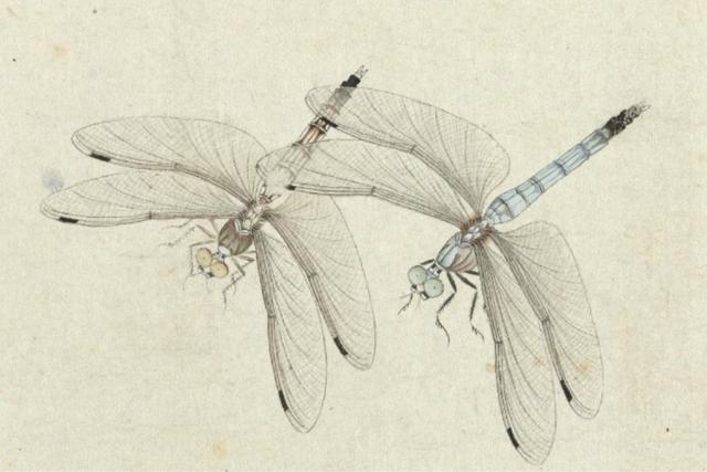 画作中这两只比邻的蜻蜓个体,因为外形近似,仅有体色上的差异,推测作者是在描绘同一种蜻蜓的雌、雄个体。在蜻蜓与豆娘中,有不少物种的雄性与雌性拥有不同的体色,形成男女有别的花纹样貌。