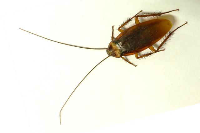 由细长的丝状触角,发达的前胸背板,叠合的革质翅及多刺的足,可以得知此昆虫为蜚蠊,也就是我们熟知的蟑螂;再根据革质翅无白色纵带的特征,鉴定为美洲蟑螂 (Periplaneta americana),为台湾地区居家常见蟑螂之一。喜欢温暖、潮湿、阴暗的环境,负趋光性,因此较常在夜晚遇见它们。若想减少蟑螂出现在家中的机会,保持环境整洁、干燥,并妥善储存食物,是减少蟑螂出现的最佳方法。