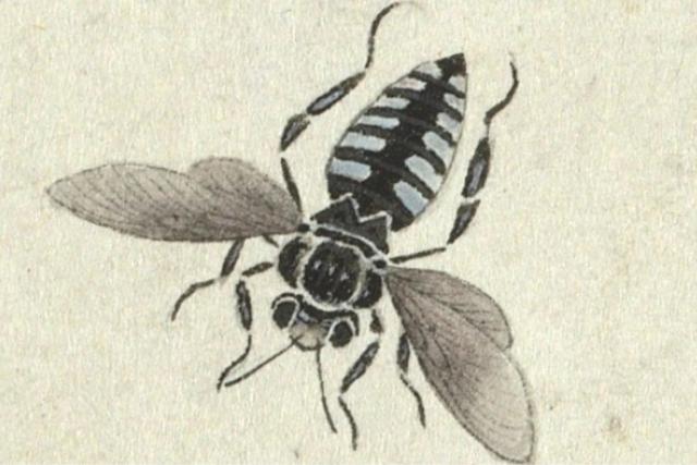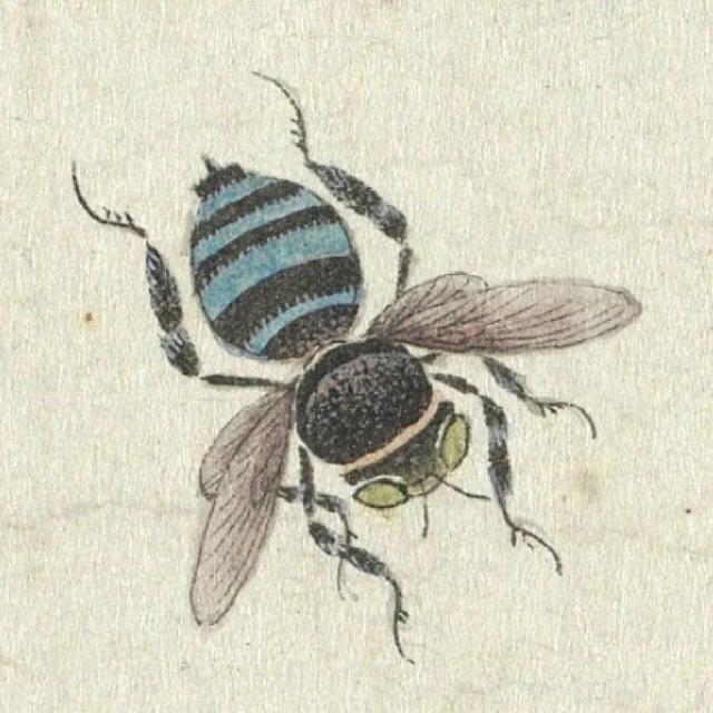 画中这只蜂的体色主要为黑色,腹部具有蓝色条带,后足胫节膨大,复眼略带绿色,依据上述特征及体态,推测可能是在描绘膜翅目蜜蜂科条蜂族 (Anthophorini)的蜂类。条蜂族虽为独居性,但常与同类聚集筑巢,另外还有一点有趣的是,它在休息的时候会利用大颚咬住枝条像旗子一样悬在半空中。