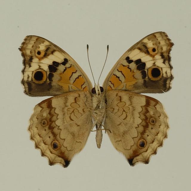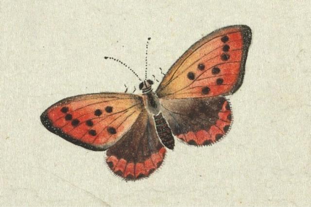 朱汝琳所绘这三只鳞翅目相当靠近,甚至互相重叠,但应不具特别生态意义!右上方体型较深的蝴蝶,不论是翅形、翅脉、尾突及斑纹等特征,都与现生的柑橘凤蝶接近;左上方覆盖凤蝶的则是一只蛱蝶,翅脉符合蛱蝶科特征且触角呈现细长笔直的棒状,在后翅具有小突起,而前后翅各一对眼纹,前翅眼纹深且较小,后翅眼纹偏粉色且大,前翅基部有一对对称的云纹状斑,判断应为蛱蝶科眼蛱蝶属的蝴蝶;至于左下方的小蝴蝶,依体型与背面色泽,或许是小灰蝶,但却是很艺术的呈现而难以科学判断,且触角为蛾类的丝状,因此也可能所绘者为蛾类!