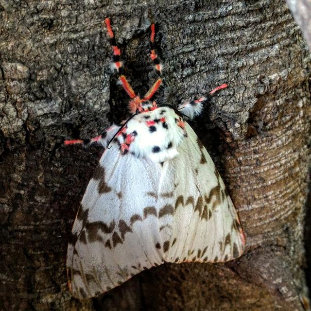 此图可能为裳蛾科中毒蛾或灯蛾亚科的物种。有许多物种成虫在裳蛾科中演化出白色的胸及翅,腹部密布红色毛绒等形态特性,在毒蛾亚科中更有许多物种带有令人刺激、发痒的毒毛,这些醒目的体色通常具有警示天敌的功能,防止天敌将其当作食物吃下。有些雌虫会有翅退化或消失现象,移动能力差,刚羽化雄蛾便已准备与其交配产卵。雌虫腹部十分硕大,能一次产下数量庞大的卵,幼虫常具有许多固定排列的长毛,如果碰到也可能引起红疹。