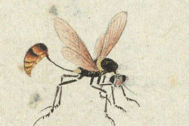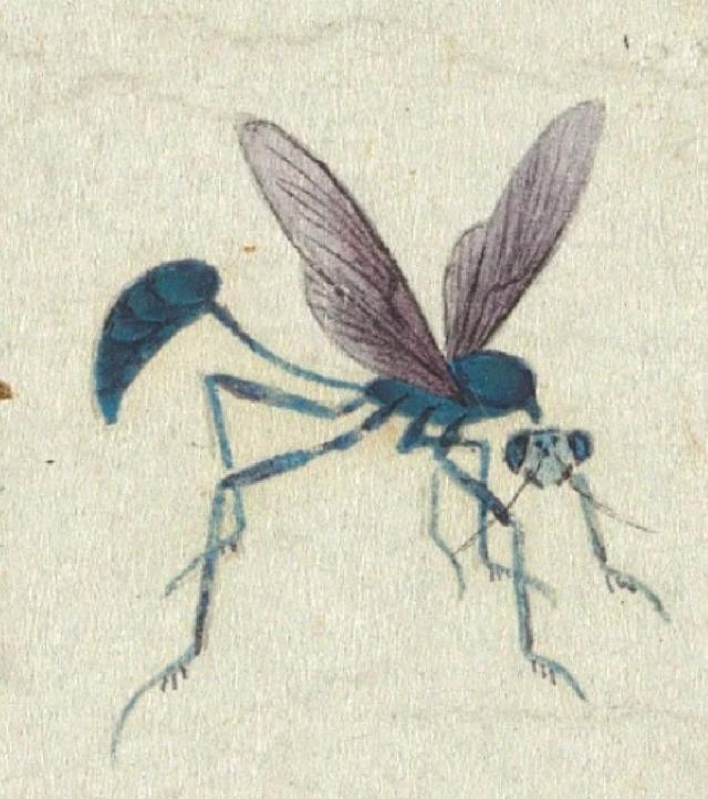 依据画中蜂的腹部有一细长管状构造,推测应为膜翅目细腰蜂科 (Sphecidae) 蜂类。