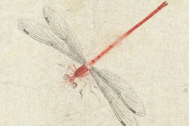 画作中的蜻蜓仿佛如彩绘图鉴般呈现,对于蜻蜓头、胸、腹与六足的描绘极其详实,唯翅膀的描绘虽然画出翅痣,但翅脉的细节仍过于简略,这点甚是可惜。