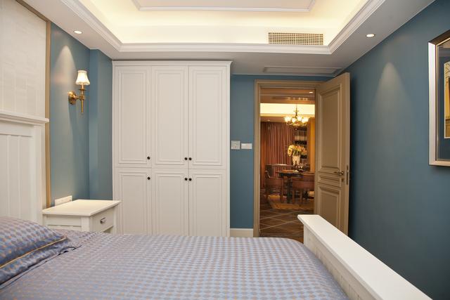 如果你的卧室形状偏向于正方形,可以在床的侧面做一个深一点的定制衣柜。定制衣柜又高又大,出现后会让房间变得狭长。