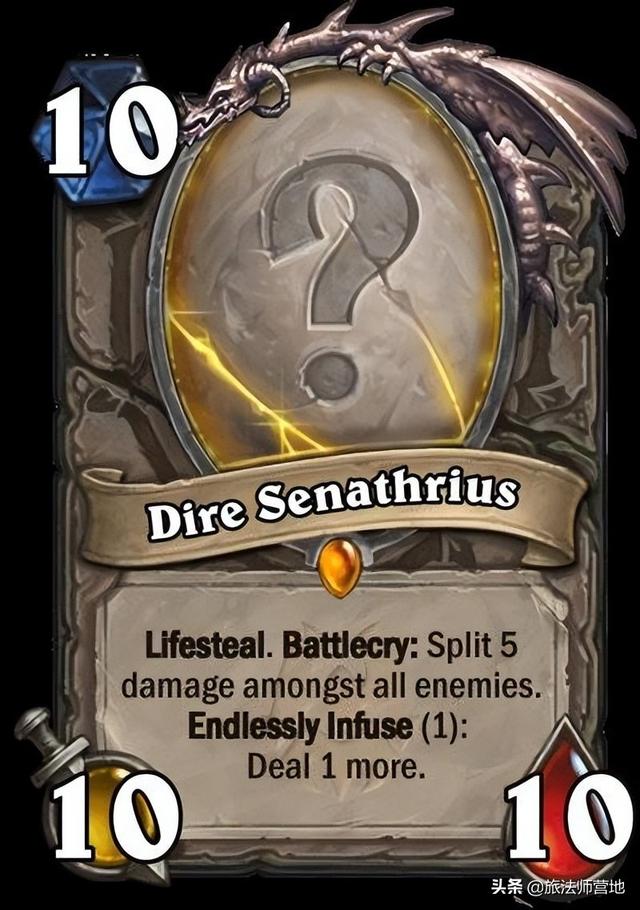德纳修斯大帝的文本框读着像是有哪里不对,因为它确实少了一个词“split(分配)”,我们在以前的效果类似的牌上都是会这么写的。但要让这一点+吸血+注能都写得下,文本框就会太满,无法令我们满意。