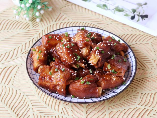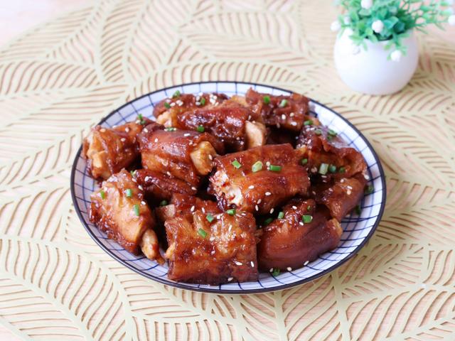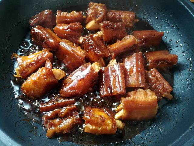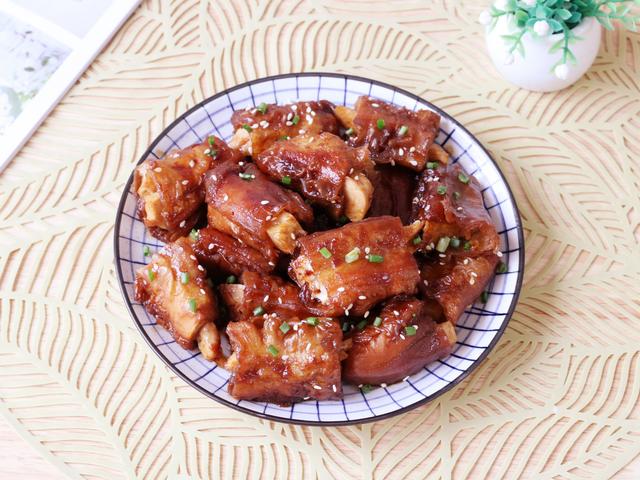 糖醋酱汁煮到浓郁,素排骨表面变得有些绵软,就可以关火了。