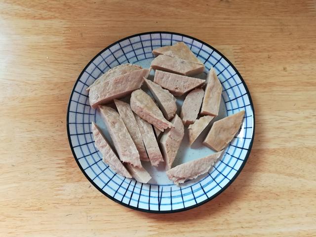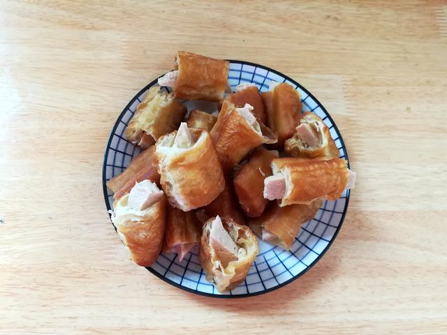 素鸡胸肉切成长4-5厘米,宽1.5厘米的大小,整体要比油条小且长一点。素鸡胸肉是一种大豆制品,吃起来有吃肉的感觉,油条和它真是绝配。