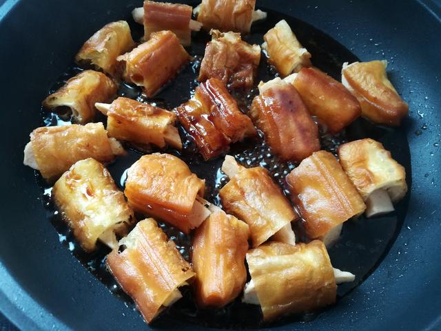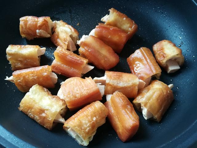 热锅放油,放入素排骨煎一下,有些做法是油炸,我觉得油炸的话,油条会吸油,吃起来有些油腻,不是很健康。
