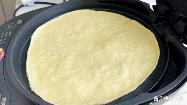 电饼铛提前预热,不用刷油, 把饼坯放入里面,盖上盖子,烙至定型,看到电饼铛帽热气打开盖子,翻个面, 盖上盖子再烙十几秒,电饼铛再次冒热气打开盖子看一下,这个饼非常的薄,全程大约烙一分钟就可以了,现在已经熟了,这个饼非常轻松就能揭开了,出锅放入盘里。