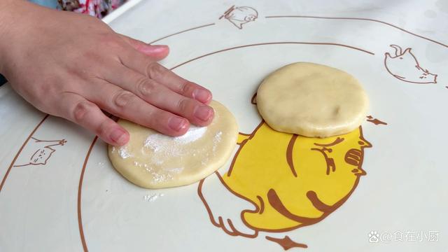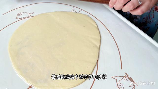 20分钟之后面已经醒好了,取出一个小面团放在揉面垫上按压一下,在上面撒一点面粉,在取一张小面团按扁,把两个面片螺在一起,正反面都给它用手按压一下,用擀面杖擀开,正反面都要擀一下,最后擀成这样子就可以了,大约两毫米左右。