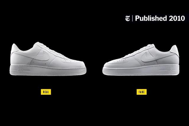 《纽约时报》发布的真假耐克鞋对比,可以看出假鞋与真鞋相差无几,肉眼几乎看不出差别。