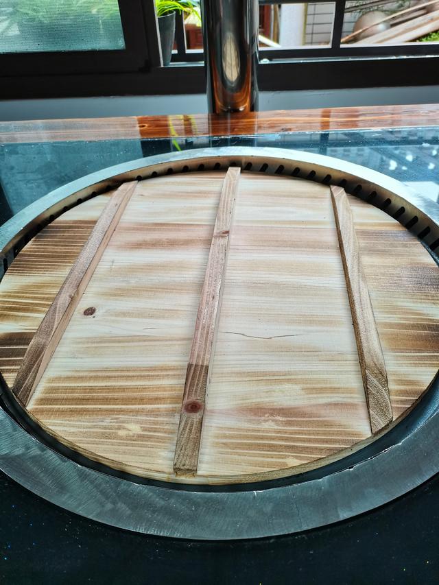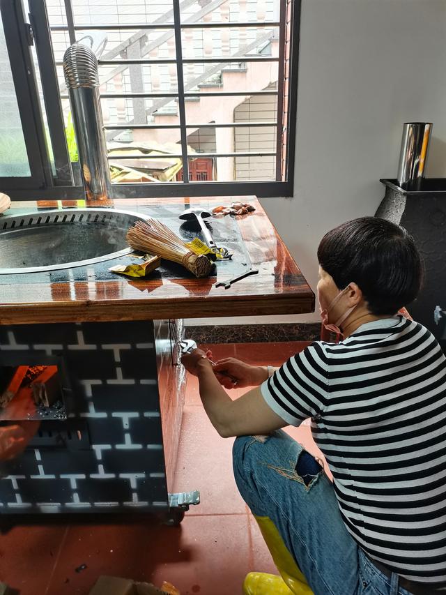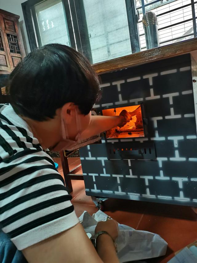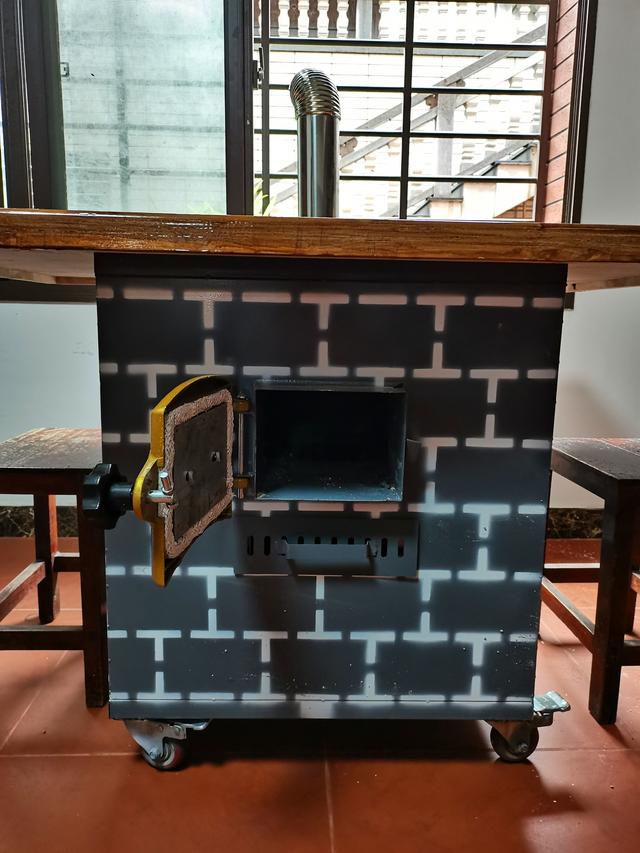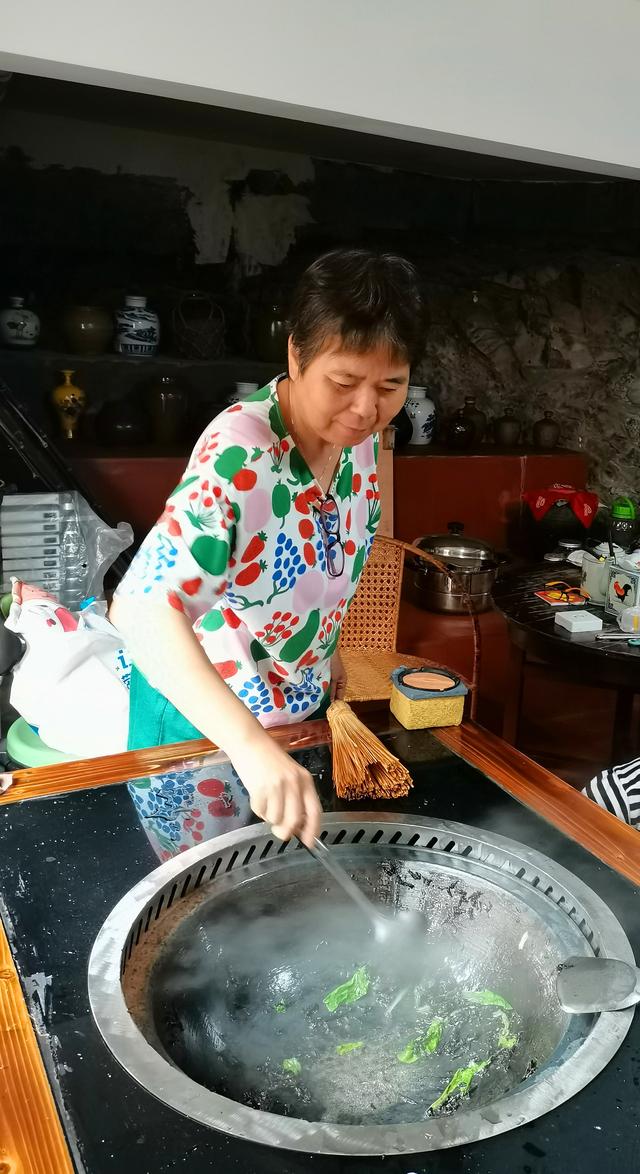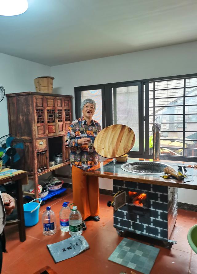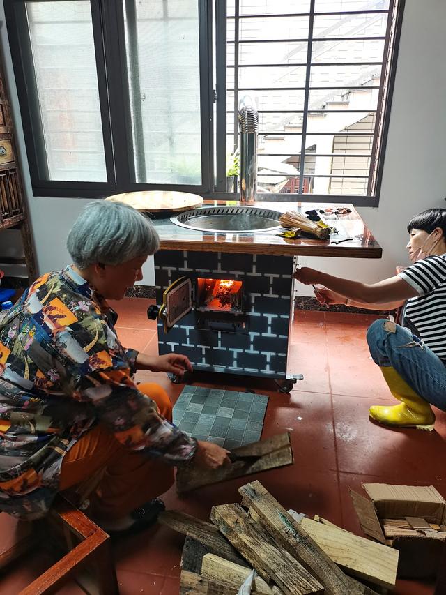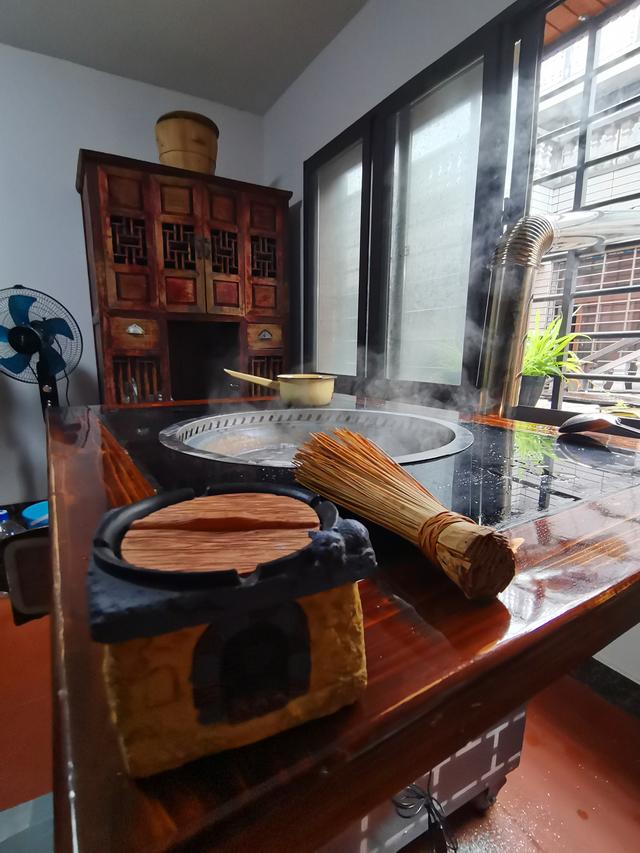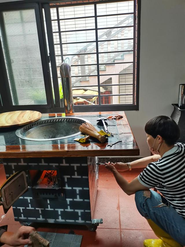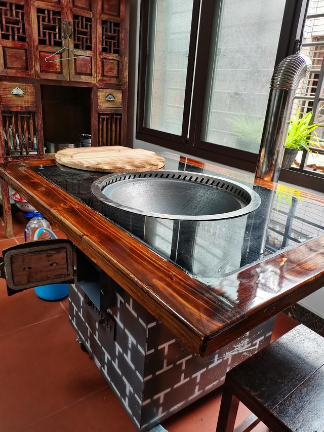 灶内塞满了木柴,让人瞬间就有小时候烧火做饭的即视感,柴火灶,一个四方的小口开在了餐桌下面,熊熊燃起的柴火,配上一只老铁锅,添柴点火……