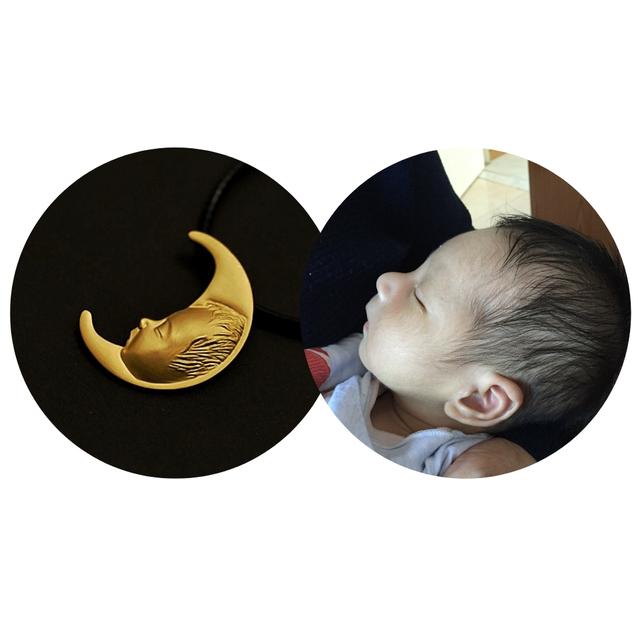 就这样不断打磨,直到最后的成品成型,结果证明一切付出都是值得的。项链采用的是18K彩金,不仅突出了“日”“月”的造型,还用宝宝的两张照片定制了造型,日、月各一个,分别由夫妇二人佩戴。礼物本身的价值不见得非常高,但这份执着和用心让它变得独一无二。