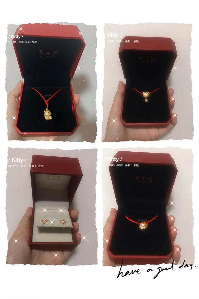 虽说“每个节日送个小金饰”听起来轻而易举,仿佛是个正确答案写在眼前的送分题,但先生可没少用心。他知道颖儿喜欢Hello kitty,就为她“集邮”了Hello kitty系列的各个品牌、各个造型的各种金饰。今年,颖儿还不负众望地收到了周大福家的本命年专属小金虎,她爱不释手,平常一直戴在身上。