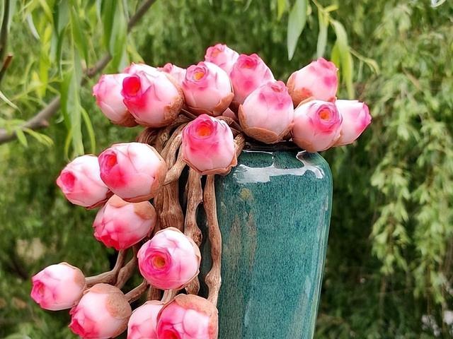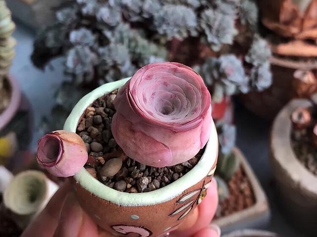 用来表达爱意,玫瑰花肯定是首选,在多肉的大家族里面也有玫瑰系列,虽然不是鲜花,但是株型酷似玫瑰,浑身上下都透漏出浪漫气息,关键是它们不像鲜花那么容易凋谢,可以称其为永不凋谢的玫瑰花,像可爱玫瑰、冰玫瑰、法兰西玫瑰、女王玫瑰、阿吉塔玫瑰、小球玫瑰都是不错的选择,不过目前这个季节,颜值最高的当属山地玫瑰系列了,夏季它们正处于休眠期,叶片紧紧包裹起来,有一些品种还会出现粉色,用来表达爱意,新颖又贴切,真是不错的选择。