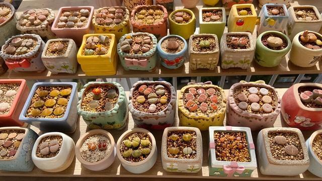 生石花也叫PP花,叶片对生,养护的得当的情况下,肥嘟嘟的非常漂亮,把它们养护在花盆当中,就像一颗颗小蘑菇、小石头一样,非常萌,而且养护3到5年的生石花还会开花,花朵小而美,看起来非常精致。由于它们生长速度慢,个头小,搭配一个精致的小花盆,当成是礼物话是完全可以的,商家根据它们的生长特性,赋予它们的花语是爱如磐石,坚不可摧的爱情,寓意非常好。