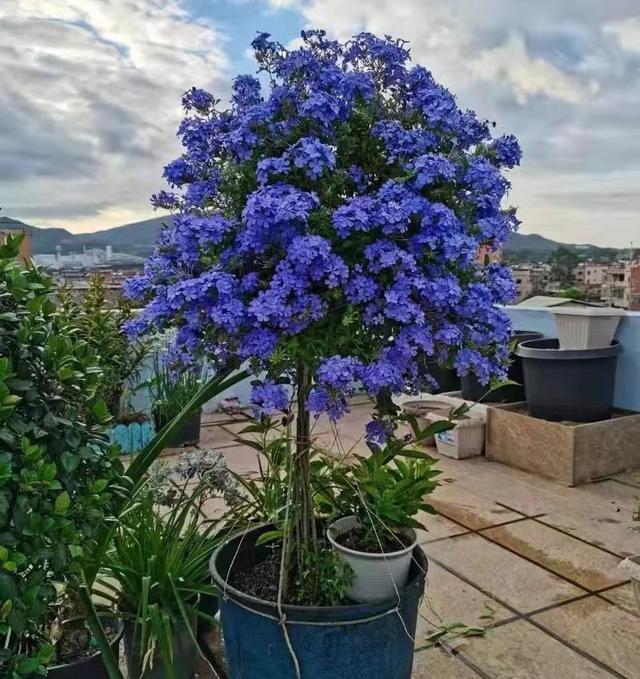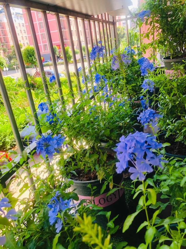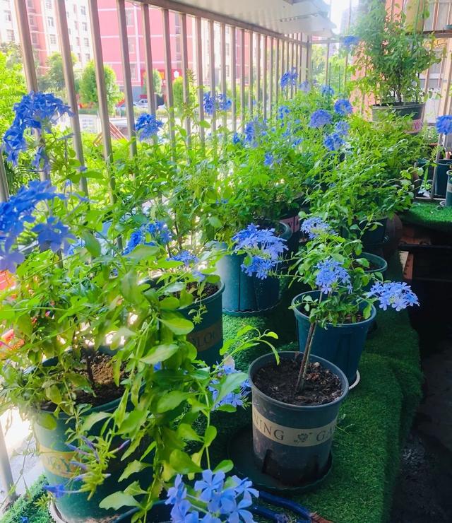 如今大大小小也有十四盆蓝雪花了,我把它们像珍宝一样地放在一个露出来的阳台里,满满当当郁郁葱葱。